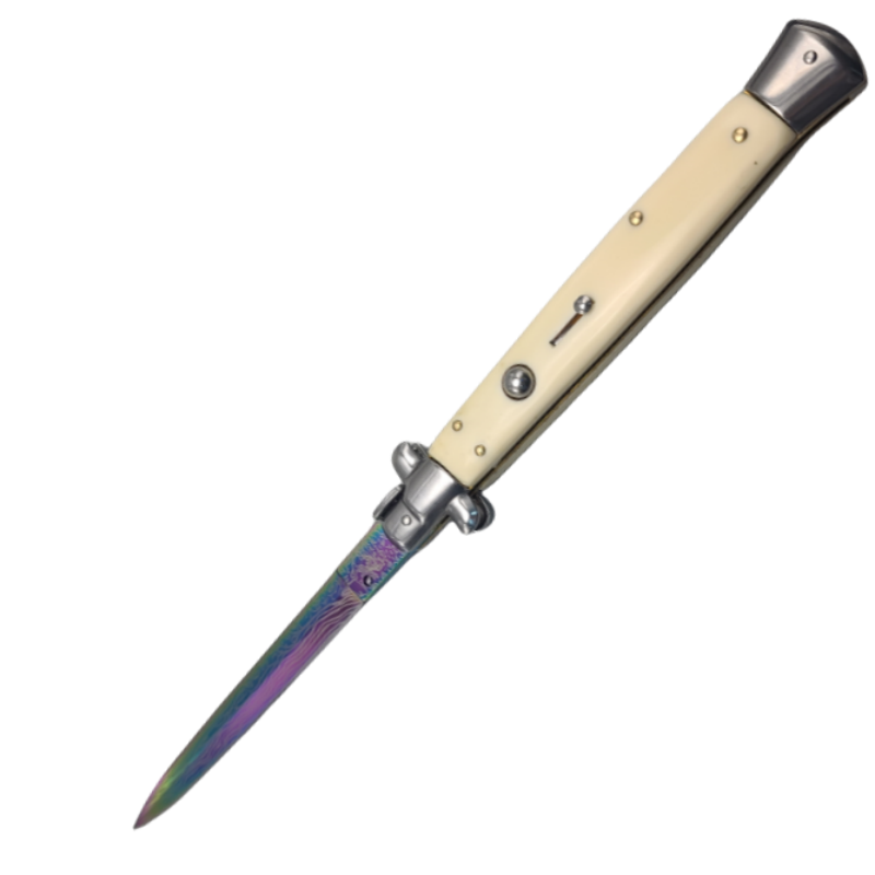 The automatic Italian stiletto knife has a great vintage look that will be appreciated by knife collectors and a solid blade that will get the job done. Using the stainless steel blade is quick and easy when you press the button on the handle. The handle scale is completed with polished stainless steel bolsters. The overall 13″ stiletto knife can be stored in the included nylon pouch.