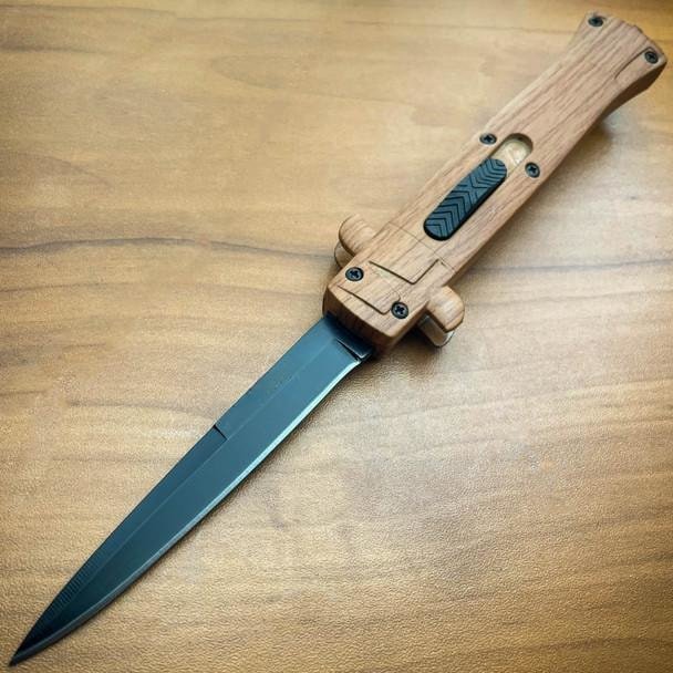 Get the best of both worlds with the Stiletto OTF automatic. This knife brilliantly combines the classic style of an Italian stiletto and the tactical speed of an OTF. A front-loading thumb slide fires and retracts the blade with smooth automatic precision. Add a unique design to your collection with the 9″ Stiletto OTF Auto.
